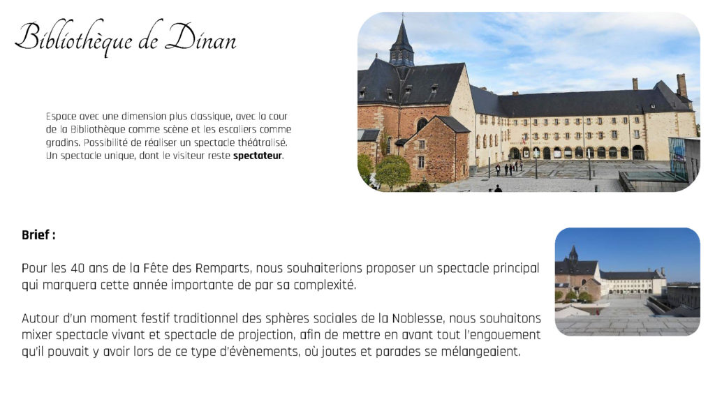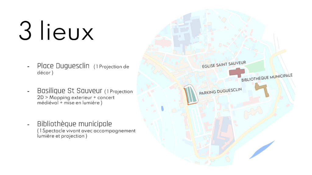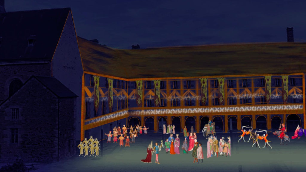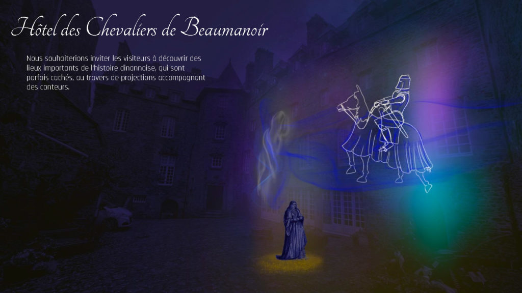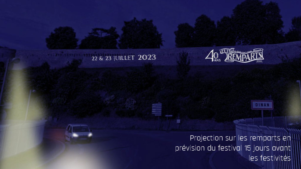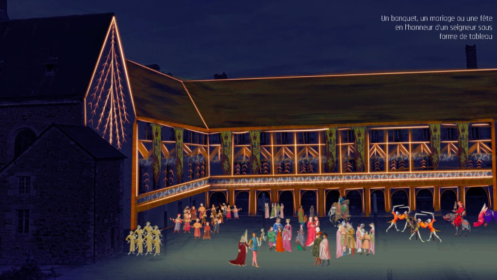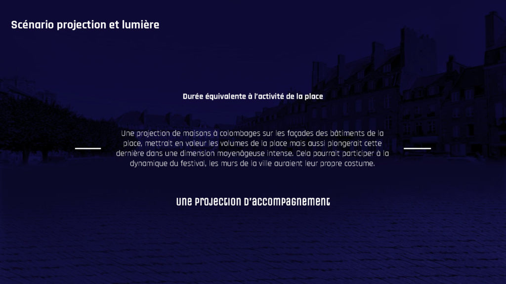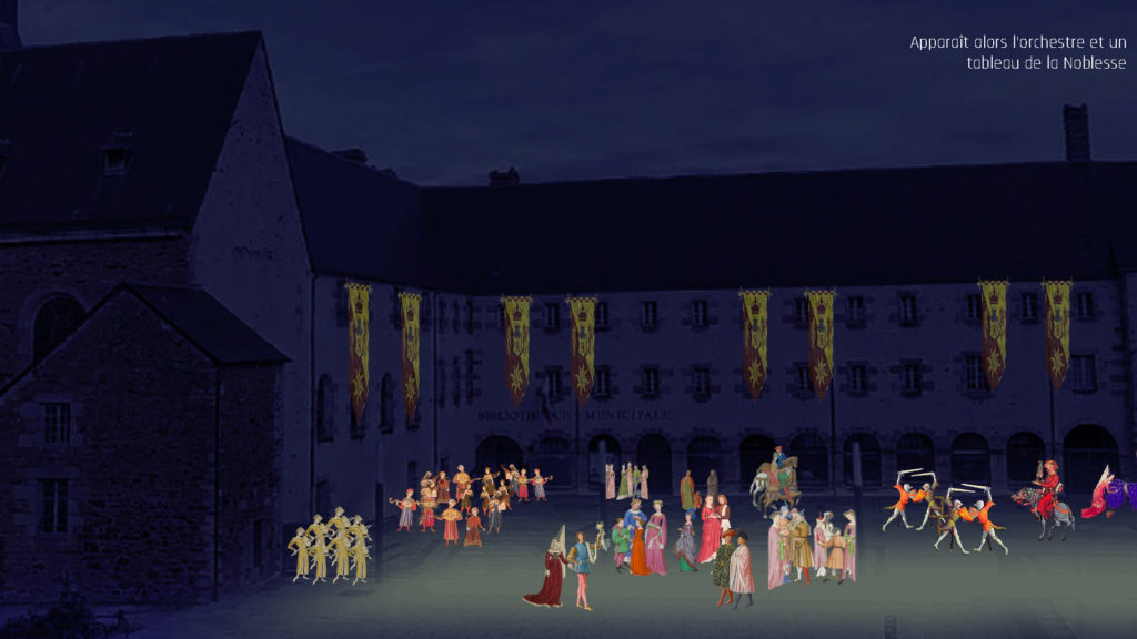 L’Association La Fête des Remparts a fait appel aux services de 109 pour les accompagner sur leur 40ème édition anniversaire. L’association a émis le souhait de moderniser cette fête dinannaise mythique avec un spectacle de son et lumière. En charge d’imaginer une trame ludique et pédagogique utilisant les nouvelles technologies, j’ai souhaité mettre en avant les sphères sociales à travers l’architecture à la suite de nombreuses recherches historiques et sensibles.