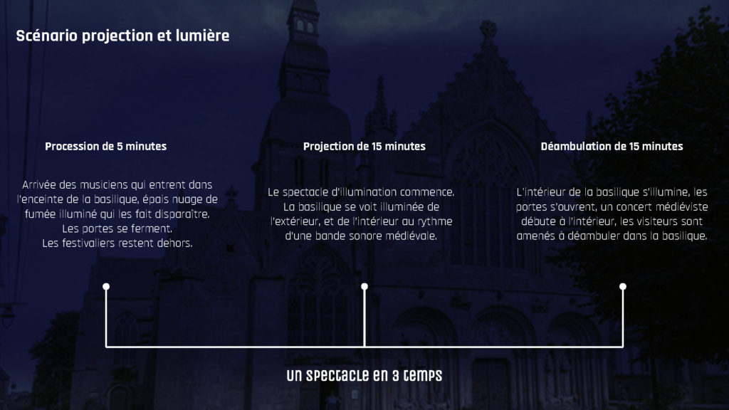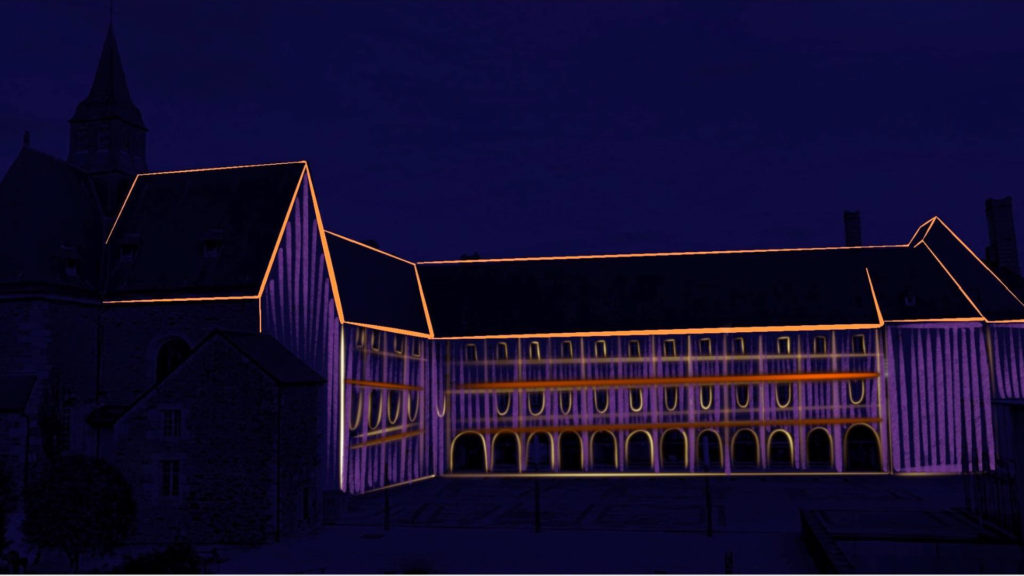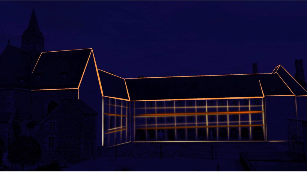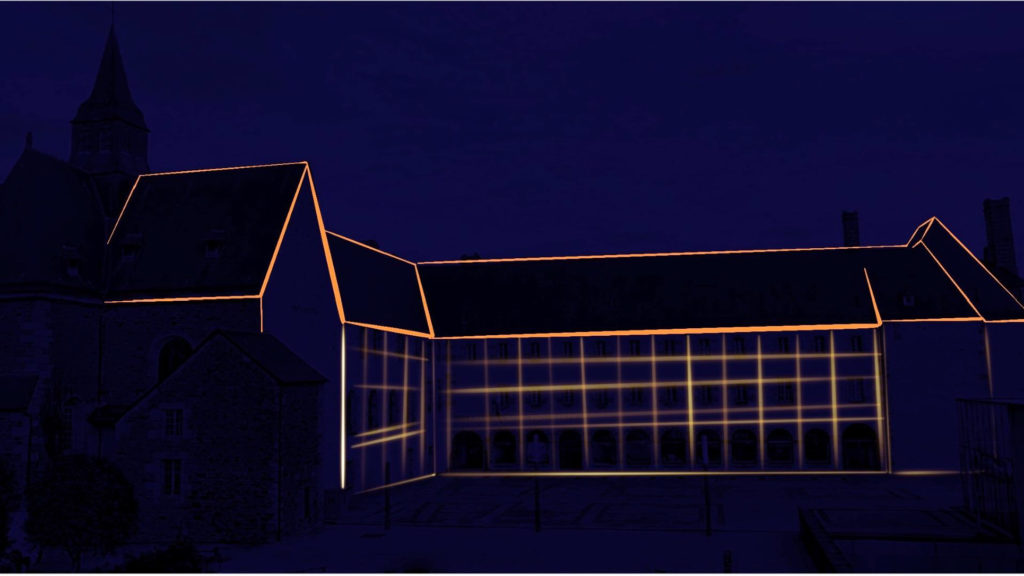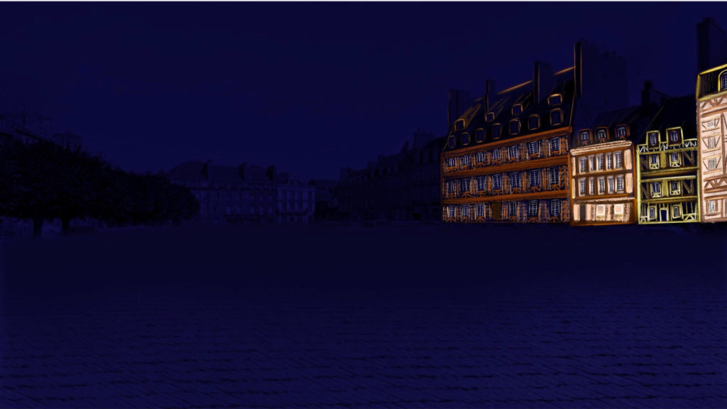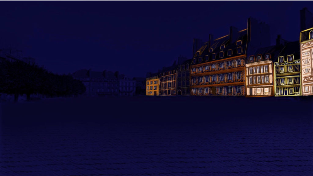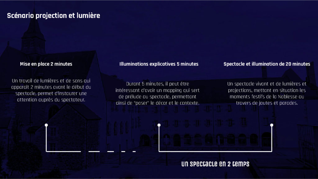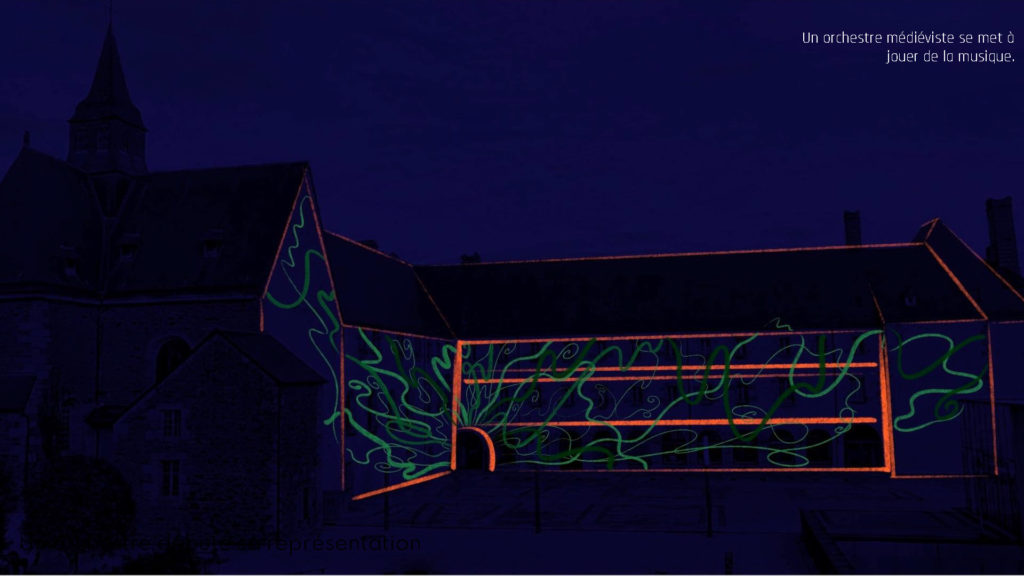 L’Association La Fête des Remparts a fait appel aux services de 109 pour les accompagner sur leur 40ème édition anniversaire. L’association a émis le souhait de moderniser cette fête dinannaise mythique avec un spectacle de son et lumière. En charge d’imaginer une trame ludique et pédagogique utilisant les nouvelles technologies, j’ai souhaité mettre en avant les sphères sociales à travers l’architecture à la suite de nombreuses recherches historiques et sensibles.