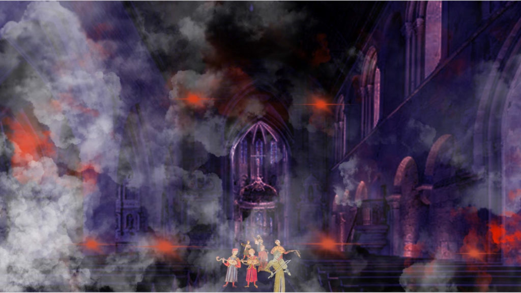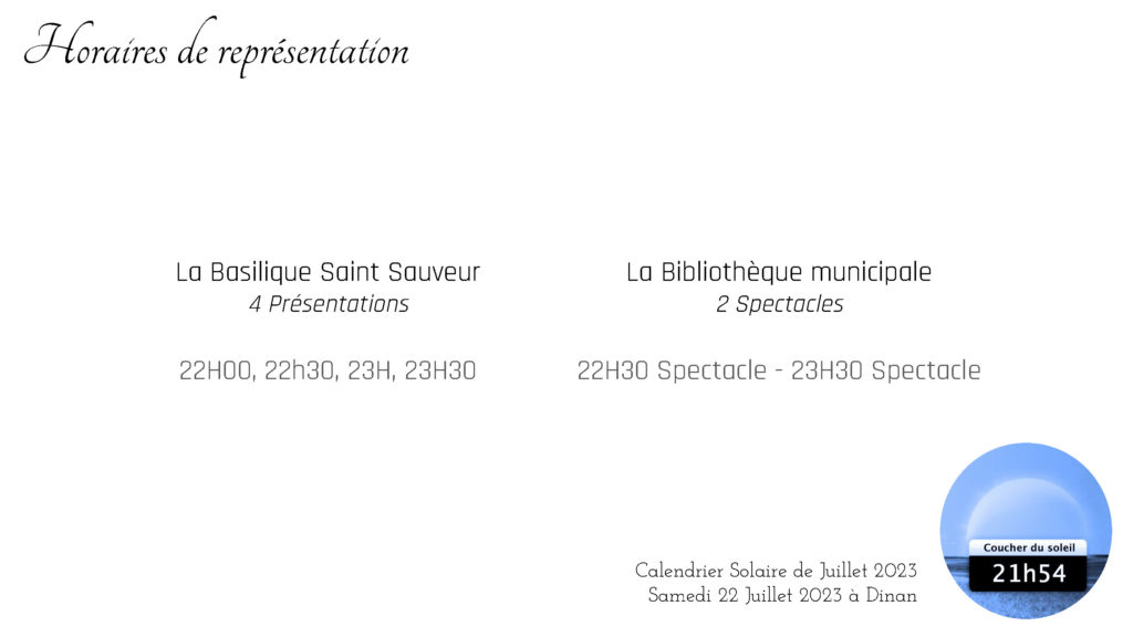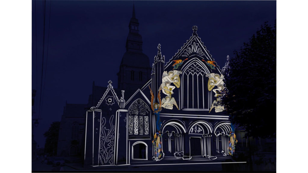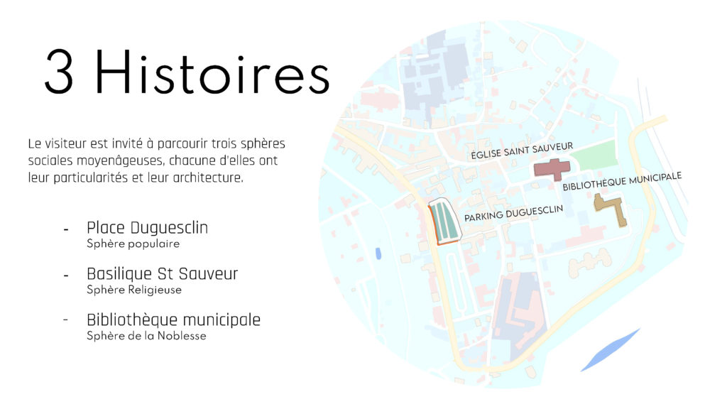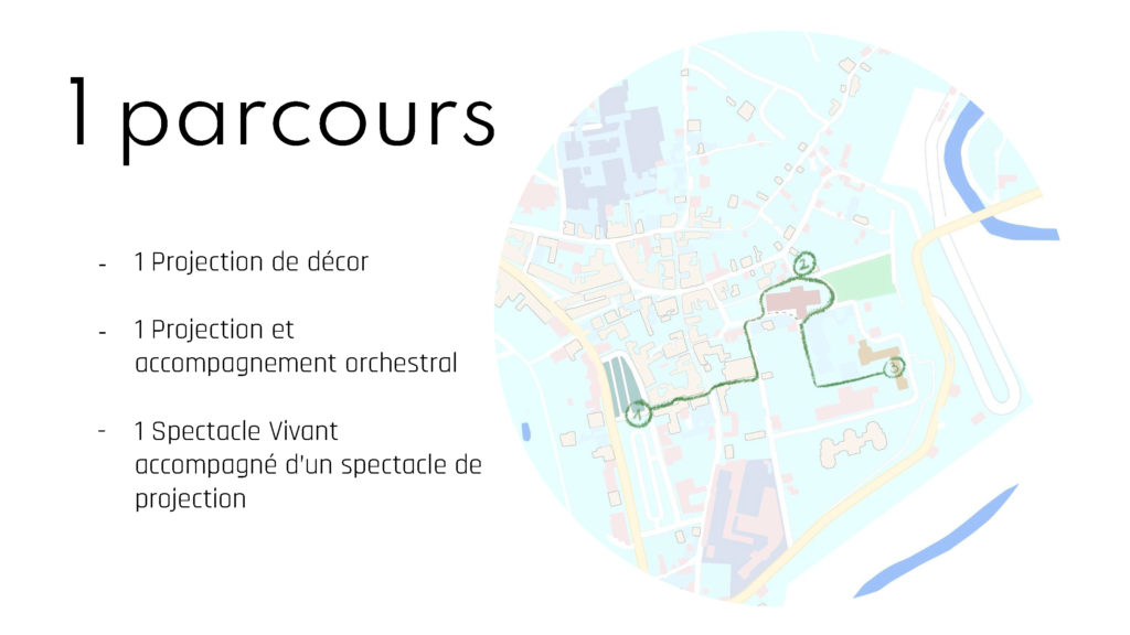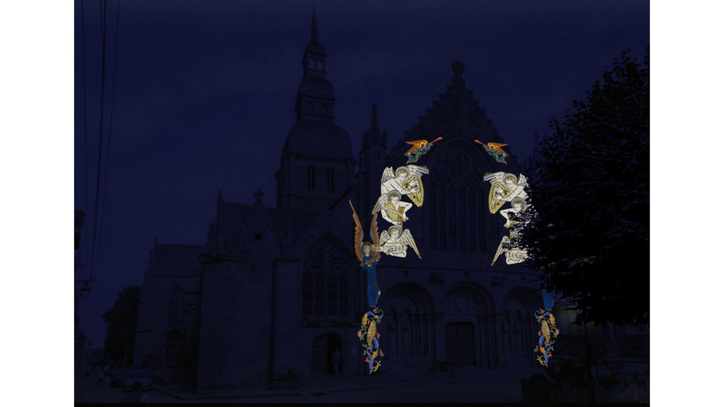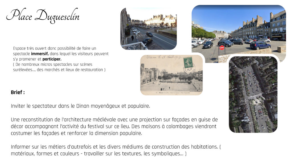 Durant un parcours en trois actes, mêlant art de rue traditionnel et nouvelles technologies ( projection ), j’invite les visiteurs à découvrir les différentes sphères sociales de Dinan à l’ère moyenâgeuse à travers l’architecture et les mythes et légendes de la région.